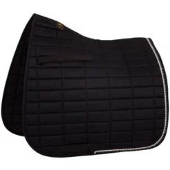 Chique, voorgevormd zadeldek van polyester katoen met een polyester Airflow voering. Het zadeldek heeft een vulling van 300 g polyfill en 10 mm foam. De buitenstof heeft een rechthoekige stepping van 10 x 5 cm. Het zadeldek is luxe afgewerkt met een zilverkleurige koordbies en een bies met imitatie diamanten. De singel- en zadellussen zijn voorzien van klittenband.
