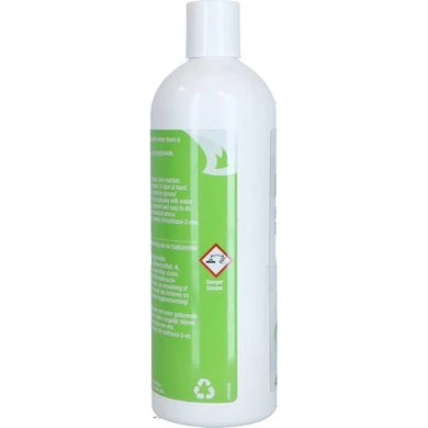 Shampoo voor paarden. Een natuurlijke, antibacteriele en antischimmel shampoo. Een deodoriserende, zeepvrije shampoo met appelgeur die gebruikmaakt van de natuurlijke antibacteriele eigenschappen van azijnzuur (azijn). Gebruik voor het onderhoud van de huid van de onderbenen. Werkzame bestanddelen: 2% azijnzuur, 2% boorzuur, Bevat ook: Natriumlaurylsulfaat, cocamidopropylbetaine, cocamide, geurversterker Richtlijnen: Goed schudden voor gebruik., Aanbrengen op natte vacht, 5 – 10 minuten in de huid en de vacht masseren tot de shampoo licht schuimt., Goed uitspoelen., Mag zo vaak als gewenst gebruikt worden of zoals aangegeven door uw dierenarts. Waarschuwing: Uitsluitend voor uitwendig gebruik., Vermijd contact met de ogen. Indien contact met de ogen optreedt, grondig spoelen met water., Als huidirritatie ontstaat of toeneemt, zet dan het gebruik stop en raadpleeg uw dierenarts., Niet gebruiken op ernstig geirriteerde huid., Buiten het bereik van kinderen en huisdieren houden., Handen wassen na gebruik. Bewaren op kamertemperatuur (tussen 15 – 30 graden C).