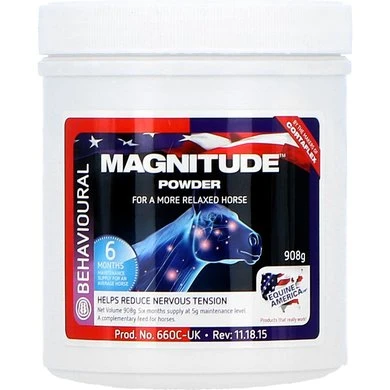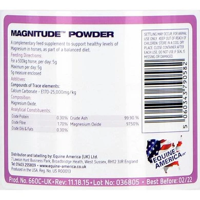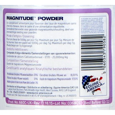 Equine America Magnitude is magnesiumoxide in poedervorm. Equine America Magnitude is goed voor de gemoedstoestand van uw paard en is goed te gebruiken in combinatie met Equine America So Kalm (Plus).