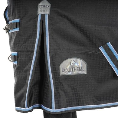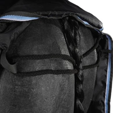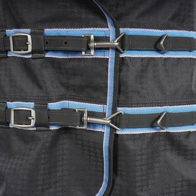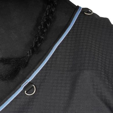 Hoogwaardige regendeken. Van 1200 denier ripstop polyester met getapete naden en een hoge waterdichtheid (meer dan 8000 mm / m²) en ademend vermogen (meer dan 8000 mvp). Antistatische en anti-schuren polyester taffeta voering en thermische isolatie gemaakt van thermo-gebonden vezels. Zeer diep ontwerp zonder rugnaad en extra lange 32 cm ‘soft touch’ micro-polaire fleece padding bij de schoft. Voorzien van inzetstukken, lage kruissingels, verstelbare en verwijderbare elastische dijriemen met drukknopen, staartflap en staartriem. Borstsluiting is verstelbaar met riemen en sluit eenvoudig met dubbele drukknopen versterkt met klittenband banden. Gespen met gesatineerde afwerking.