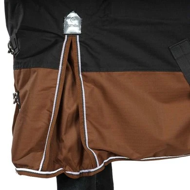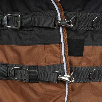 Waterdicht, ademend buitendeken van Ripstop 600 deniers 3000/3000 polyester met getapete stiksels, nylon voering. Wordt geleverd met een zeer grote waterdichte staartflap, een comfortabele kruisje, een schoftkussen in synthetisch schapenvacht, lage kruissingels en een verstelbare achterriem. Snelle borstsluiting met drukknoop, versterkt met klittenband banden.