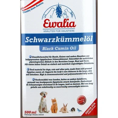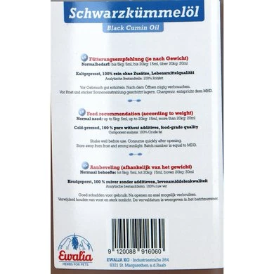 Voedermiddel voor paarden gemaakt van koudgeperste Egyptische zwarte komijn. Ondersteunt de lichaamseigen weerstand in de longen, huid en darmen. Met een hoog gehalte aan enkelvoudig en meervoudig onverzadigde vetzuren.