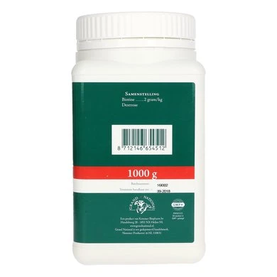Grand National Biotinemix. Vitamine H speelt een grote rol bij de stofwisseling. Bij tekorten treden hoef en huid problemen op bij paarden. Slechte hoornkwaliteit is een indicatie. Een dagelijkse hoeveelheid Biotinemix voorkomt deze problemen.