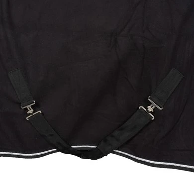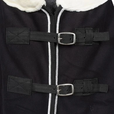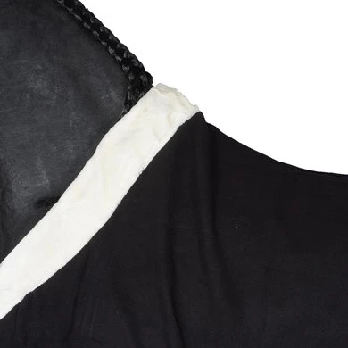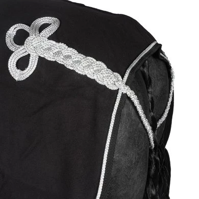 Hoogwaardige kwaliteit fleecedeken met dubbele voorsluiting, afneembare kruissingels aan 1 kant met klittenband aan de binnenkant van de deken, zilver koord rondom en zilveren rozet, zacht nepbont langs de hals Materiaal: 100% polyester