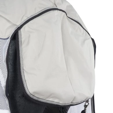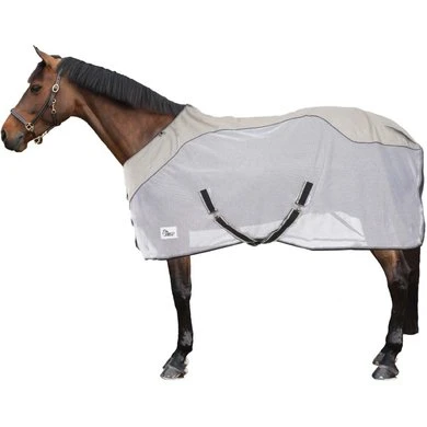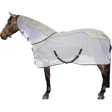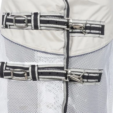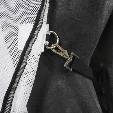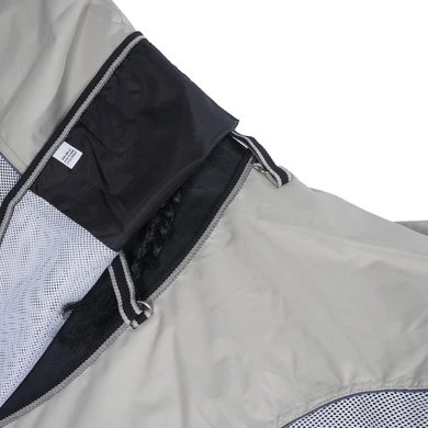 Vliegendeken voor een regenachtige dag, met afneembare hals met waterdichte rug en bovenkant van de afneembare hals, twee snelsluitingen aan de voorkant en twee klittenband sluitingen aan de hals, de hals is afneembaar dmv D-ringen, twee kruissingels, twee elastische afneembare bilkoorden en een staartflap. 100% polyester 600D PU coating on back