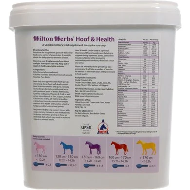 Onderzoek heeft aangetoond dat een goede voeding de meest belangrijke factor is bij de ontwikkeling van stevige, gezonde hoeven en een goede, algemene gezondheid. Hoof & Health bevat verschillende soorten puur zeewier en rozenbottels en is daarmee een rijk voedingssupplement vol mineralen als iodine, zwavel, ijzer, calcium, koper, magnesium en selenium. Ook is Hoof & Health voor je paard een bron van aminozuren en vitamines zoals bètacaroteen, vitamine B1, B2, B12, C, D en E.