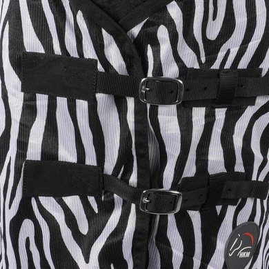 De HKM vliegendeken Zebra is extreem winddoorlatend en duurzaam. De deken is voorzien van metalen borstsluiting, dubbele borstsluiting, buikflap, staartriem, staartflap en extra lange zijkanten. De stof is van hoogwaardige kwaliteit, 100% polyester. De deken is onderhoudsvriendelijk. De zebraprint vermindert de hoeveelheid aanvliegende insecten. Wasmachinebestendig tot 30 graden, mag in de droogtrommel.