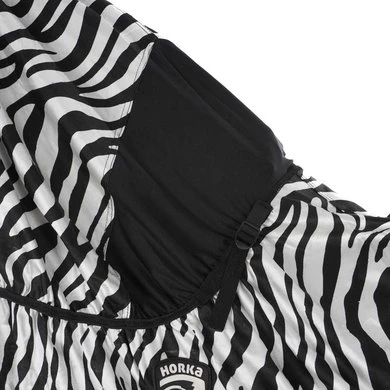 De Horka eczeem deken is een deken van 100% polyester. Deze deken heeft een vaste hals, afneembare buikbeschermer en een lange brede staartflap. De deken gaat aan over de hoofd van het paard en heeft hierdoor geen borstsluiting. De deken is vast te maken door clipsluitingen en sluit goed aan op het paard door gebruik van elastiek. Het eczeem vliegenmasker is los verkrijgbaar.