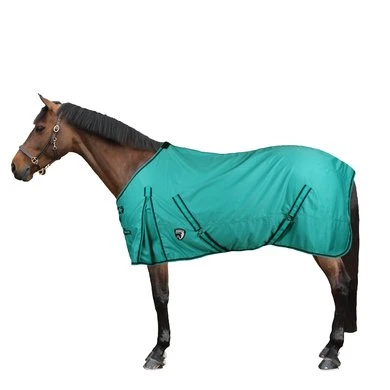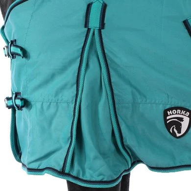 De Horka zomerdeken is een 0g deken van sterk en snel drogend 100% polyester met nylon gevoerde borst. De deken heeft een dubbele gespsluiting op de borst, kruissingels met elastisch eind en rubber stops, afneembare elastische bilriemen, een schoftbondje en extra hoge loopsplitten voor meer bewegingsvrijheid.