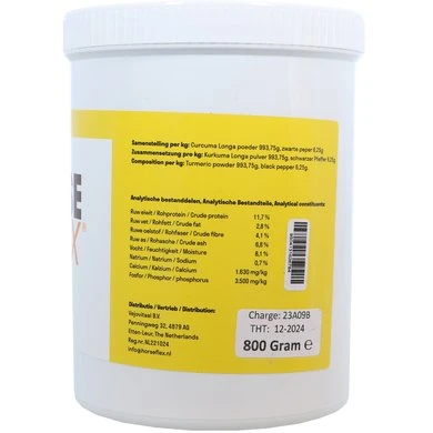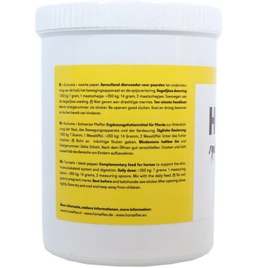 Het geel-oranje poeder wordt gemaakt van de verpulverde wortel van een speciaal geteelde variant van Curcuma Longa. De actieve stof in de wortel van deze plant is curcumine, dit is een antioxidant. HorseFlex Curcuma bevat een kleine hoeveelheid zwarte peper wat de opneembaarheid van Curcuma optimaliseert. HorseFlex Curcuma wordt veelal ingezet voor behoud van soepele gewrichten, een goede darmfunctie en een gezonde huid.