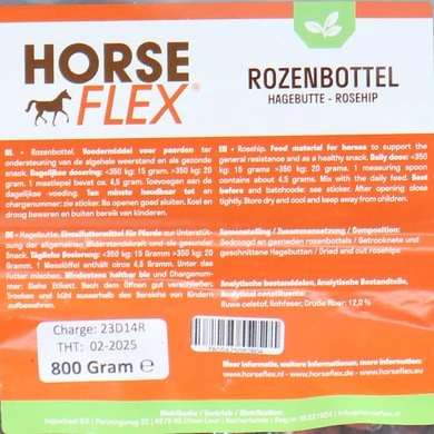 Rozenbottels zijn de vruchten van de rozenbottelstruik en van nature zeer rijk aan verschillende voedingsstoffen zoals biotine en vitamine C. Hierdoor draagt het bij aan een gezonde hoefgroei, behoud van een goede weerstand en ondersteunt het de natuurlijke afvoer van afvalstoffen. HorseFlex Rozenbottel bestaat uit 100% gedroogde bottels en een gezonde toevoeging op de dagelijkse voeding van het paard.