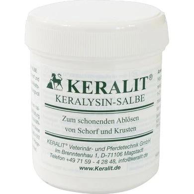 Lost korstjes en korstjes voorzichtig op. In het geval van mallenders, eczeem en oudere huidletsels, bedekken korsten vaak de aangetaste delen van de huid, hechten zich hardnekkig en blijven aan de haren kleven. Dit betekent dat ze een zinvolle behandeling van de onderliggende ziekteverwekkers in de weg staan. De extreem dunne oliën van de KERALIT Keralysin Zalf infiltreren en verzachten deze korstlagen en maken ze los. Deze kunnen dan voorzichtig worden verwijderd zonder mechanische irritatie of letsel aan de huid, vaak na slechts 1 nacht aanbrengen. Alleen dan kunnen voorgeschreven ontsmettingsmiddelen of medicijnen hun optimale werking bereiken. KERALIT Keralysin Zalf is zeer nuttig gebleken, vooral bij Friezen of andere paarden met lange kogelveren, omdat het niet nodig was om de veren voor de behandeling te verwijderen.