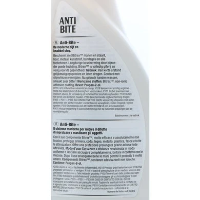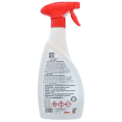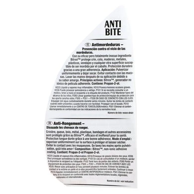 Anti-bite is een moderne preventie tegen het kauwen en het knagen aan allerlei producten! Met zijn actief ingrediënt BitrexTM, is de AntiBite hoogst efficiënt, maar er is absoluut geen risico voor de gezondheid van het paard. AntiBite kan op hout, metaal en plastic gebruikt worden. Ook de manen en staart van het paard kunnen er mee beschermd worden tegen kauwen door weidegenoten of veulens. BitrexTM is een uiterst bittere substantie, maar geurloos en volledig veilig voor ruiter en paard. Makkelijk aan te brengen in spuitbus, geen vieze handen!