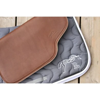 Golvend gestikt gevuld sjabrak. Gevoerd met witte honingraat stof. Twee singellussen van nylon (één aan iedere kant). Geborduurd springend paard aan de linkerkant. Buitenkant: 60% polyester + 40% katoen. Vulling: 100% Polyester. Voering: 100% katoen. Machine wasbaar op 30°C. Niet in de droger.