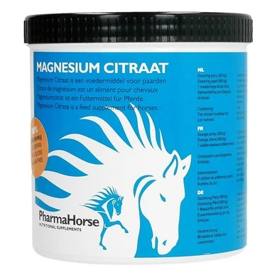 PharmaHorse Magnesium bestaat voor 100% uit Magnesiumcitraat. Magnesium draagt bij aan meerdere functies in het paardenlichaam. Zo heeft Magnesium een positieve invloed op de werking van het zenuwstelsel en is het mineraal goed voor de gemoedstoestand. Daarnaast is Magnesium goed voor het concentratievermogen en speelt het een rol bij het behouden van soepele spieren en voor het behoud van sterke botten.