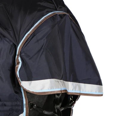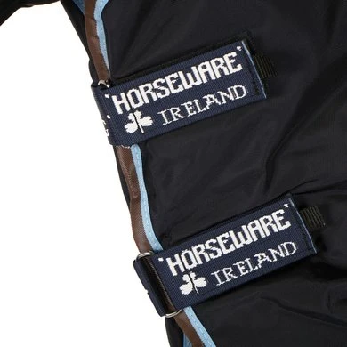 De Rambo Duo Turnout is gemaakt van zeer duurzaam en sterk materiaal. De buitenstof is gemaakt van zeer sterk 1000D ballistic nylon, dit materiaal wordt ook gebruikt voor kogelvrije vesten. Deze stof is veel duurzamer dan andere soorten dekens en halsstukken van nylon. De deken is 100% waterdicht en de binnenzijde van de deken is voorzien van een permanente polyester antistatische en antibacteriële laag. Dankzij deze laag wordt de groei van bacteriën geremd, hierdoor wordt de kans op infecties en allergieën verminderd. De deken heeft een V-front sluiting, wat voor bewegingsvrijheid om te grazen zorgt. De deken bevat anatomische beenbogen voor meer bewegingsvrijheid bij de benen, reflecterende strips, een bilkoord met hygiënisch kunststof omhulsel, extra grote staartflap, afneembare hals en drie kruissingels. De deken heeft een vulling van 100 gram en is voorzien van het Horseware Linersysteem. Deze deken wordt geleverd inclusief 300 grams liner en 100 grams halsstuk.