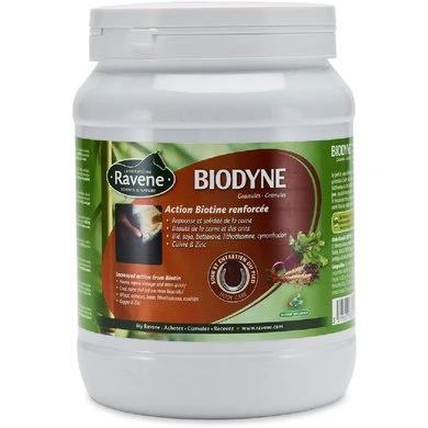 Versterkte werking van biotine.VOORDELEN: Het meest complete product op de markt!- Teruggroei en stevigheid van het hoorn- Geef 20 mg pure Biotine per dag, de ideale hoeveelheid en de enige doeltreffende vorm.- Bevat tevens elementen voor een goede opname van biotine, zoals koper en zink.PLUSPUNTEN: De esthetische kant van biotine.- Mooi hoorn en mooie manen- Smakelijke consistentieAdvies: Geef uw paard ten minste 3 maal per jaar Biodyne voor stevige hoeven, zijdezachte manen en een glanzende vacht!Gebruiksaanwijzing:Biodyne wordt geleverd in smakelijke korrels, meng gedurende 1 maand 30 g (doseerlepel inbegrepen) door het dagelijkse voer van uw paard. 3 maal per jaar herhalen. Wij adviseren u de werking van BIODYNE te combineren met PEDIFLEX (vloeibare balsem), om de hoeven van uw paard zowel van buitenaf als van binnenuit te beschermen.Samenstelling:Microfijn tarwemeel, microfijn sojameel, calciumcarbonaat, suikerbietenmelasse, lithothamium, microfijn johanusbroodpitmeel, fucus (Fucus vesiculosus), rozenbottel. Additieven voor 1 kg: – 3a- Vitamines, provitamines en substanties met een gelijksoortige werking: D-Biotine 665 mg -3b- Oligo-elementen: E6 zink (oxide) 8500 mg, E4 koper (sulfaat) 2500 mg – 3c- Aminozuren: 3c301 DL -methionine 50000 mg, 3.2.3 L-lysine 6000 mg – Technologisch: 1m558i Bentoniet 100 g, E320 BHA 2 mg, E324 Ethoxyquine 2 mg.Analytische bestanddelen: vocht