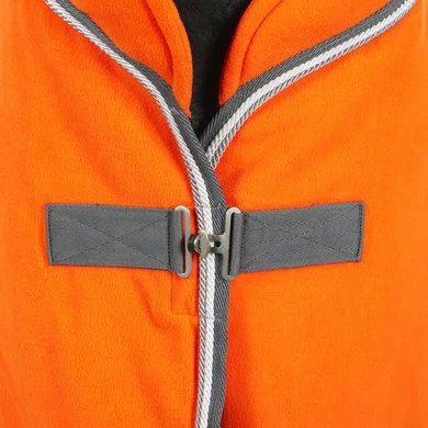 PREMIUM FLEECE RUG van hoogwaardig 270g anti-peeling fleece materiaal, met zacht gewatteerde hals voor extra comfort. Bijzonder sportief door het Schockemöhle Sport-logoborduurwerk aan de linkerkant en twee touwtjes in contastkleuren langs de rand. De fleecedeken is voorzien van een enkele afneembare elastische buiksingel.