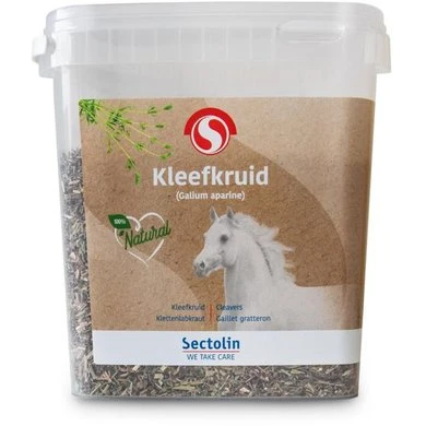 Gedroogde blaadjes van Kleefkruid. Kleefkruid wordt gebruikt ter ondersteuning van onder andere een goede bloedzuivering, de afvoer van afvalstoffen en een mooi glanzende vacht.