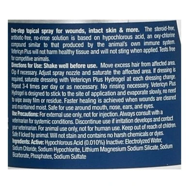 Gebruiksaanwijzing: Verwijder overtollig haar van het aangedane gebied, afknippen indien noodzakelijk. Breng Vetericyn® royaal aan. Als verband vereist is, breng Vetericyn® dan royaal op het verband aan. Herhaal dit 3-4 keer per dag. Breng Vetericyn® aan tijdens iedere verbandwisseling, naspoelen is niet nodig. Veilig om te gebruiken rond mond, neus en ogen. Dopingvrij.