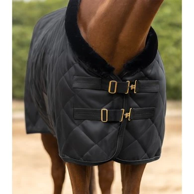 Hoge kwaliteit reisdeken, gevoerd met kunstkonijnenbont voor koude winterdagen. Het konijnenbont slaat de lichaamswarmte van het paard optimaal op, is bijzonder zacht en voorkomt wrijving. De deken is afgewerkt met een kunstbontkraag. Met in lengte verstelbare en afneembare gekruiste banden, dubbele T-voorsluiting en metalen oogjes voor een staart riem te bevestigen.